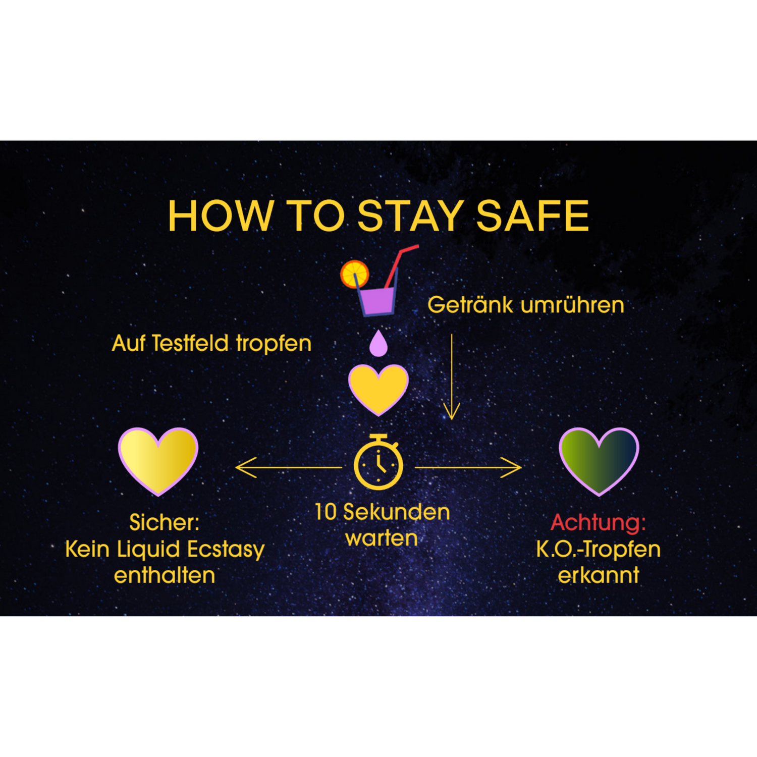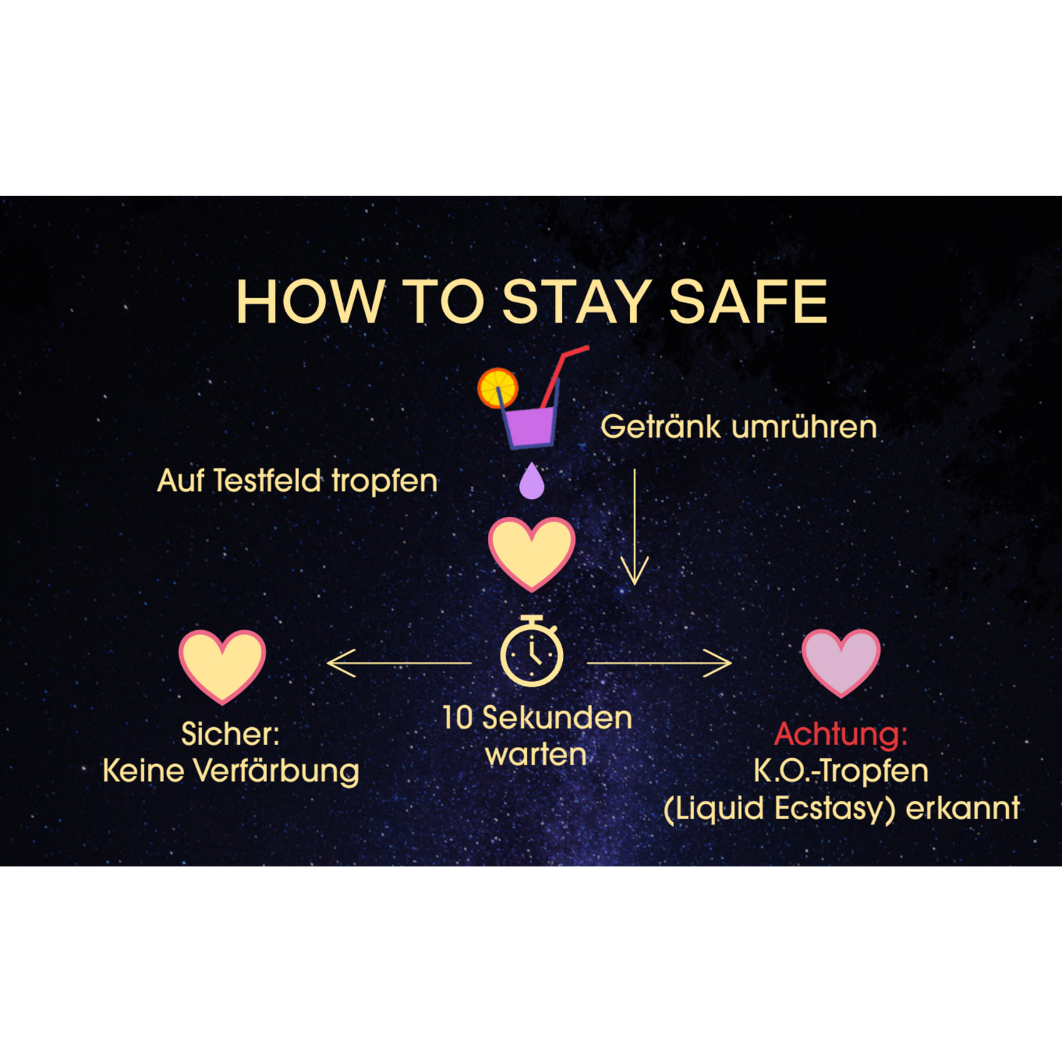 Night Saver Testkarten sind keine medizinischen Produkte. Sie ersetzten weder medizinische Untersuchungen, Labortests oder den eigenen Hausverstand. Sie dienen lediglich als zusätzlich empfohlene, präventive Schutzmaßnahme als ein Baustein in einem gesamten Sicherheitssystem.